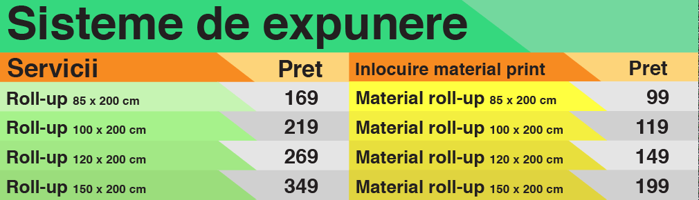 Sistemele roll up ieftine au inaltimea de 200 cm si latimi de 85, 100, 120 si 150 de cm, fiind realizate din aluminiu. Sistemul vine insotit de husa din material textil. Materialul standard pentru sistemul roll up este polipropilena mata waterproof, cu o rezistenta foarte buna atat la interior cat si la exterior